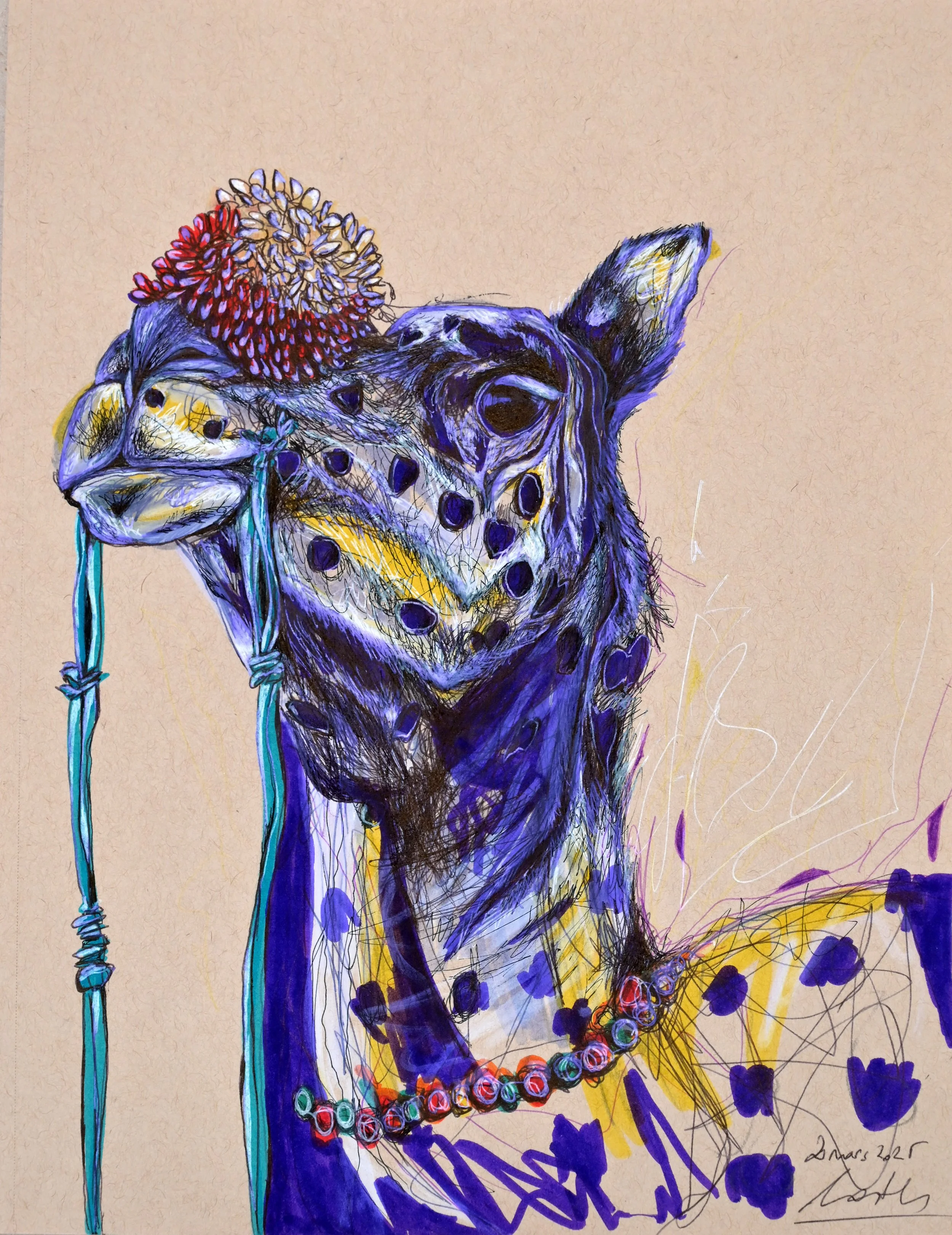 Cette série a été réalisée principalement lors de nos trajets routiers, dès que l’occasion se présentait. Elle combine différentes techniques. Feutre, stylo bille, marqueur, posca, pointe fine à l’encre et l’irrégularité du trait qui me caractérise, sans doute accentuée par quelques nids de poule.