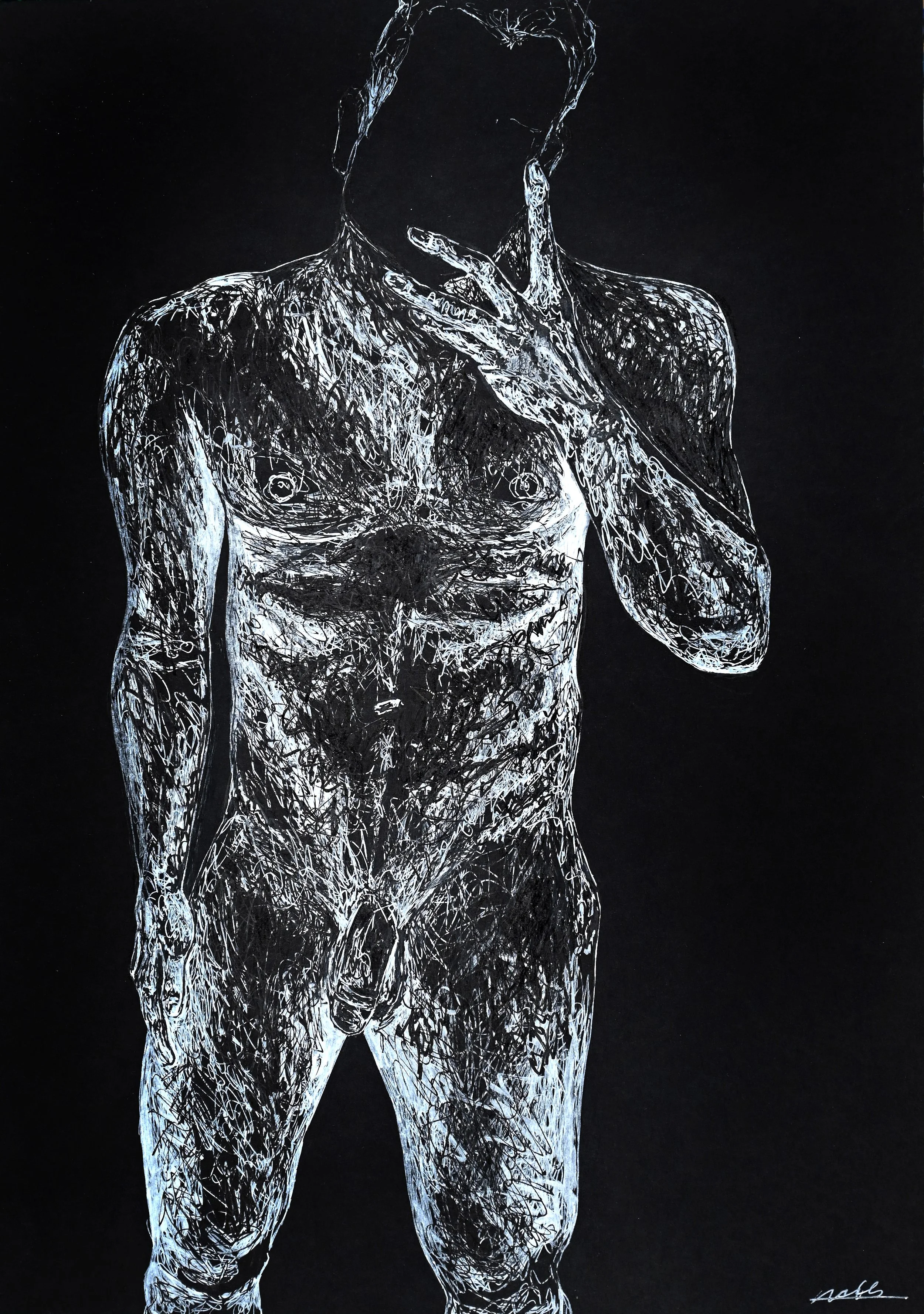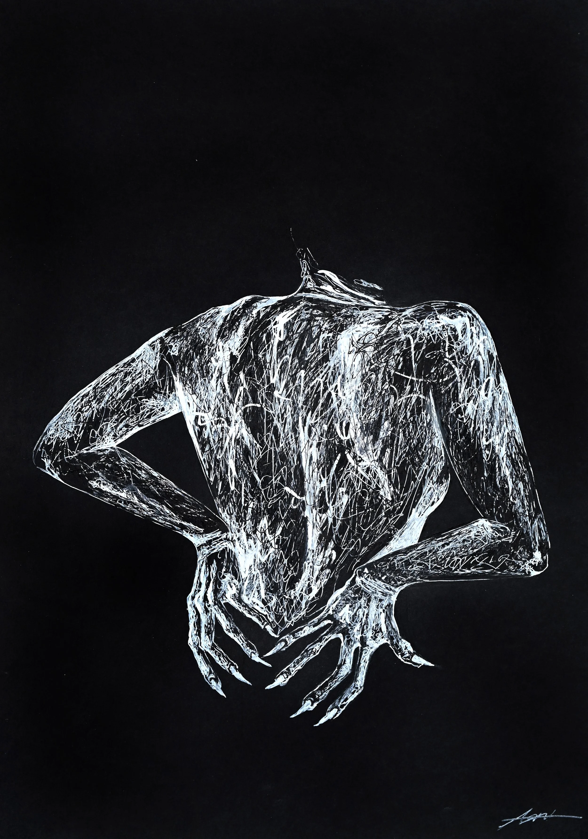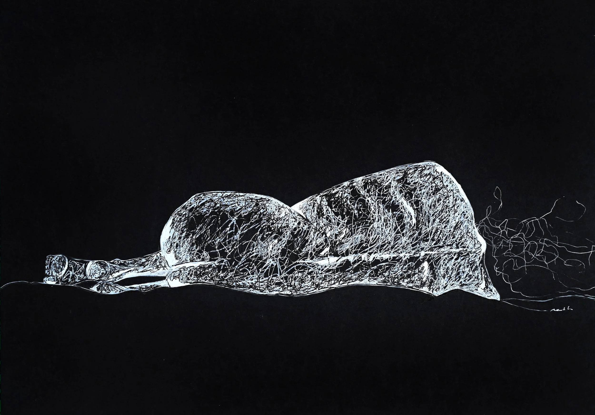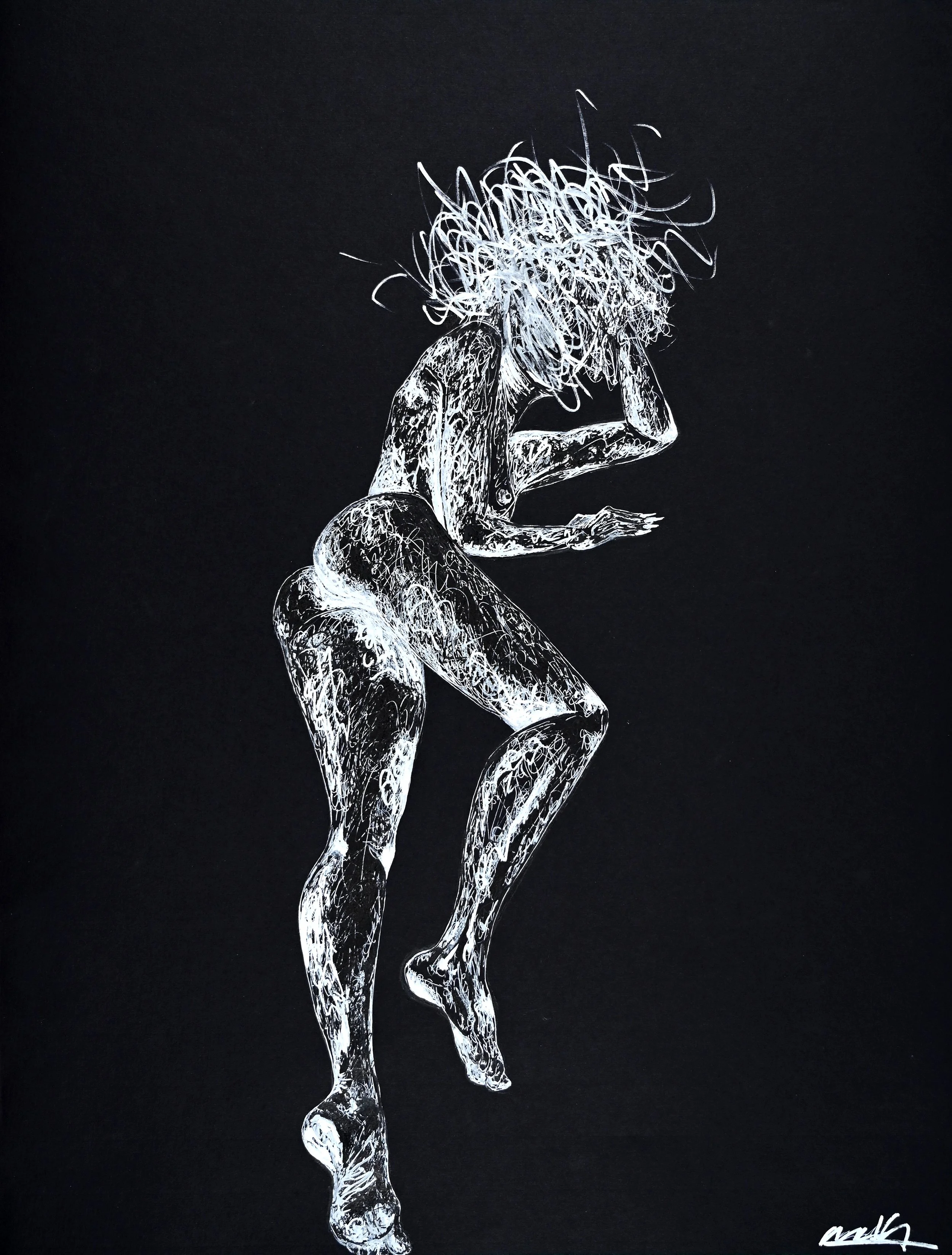 Nous avons tous et toutes nos parts d’ombres. J’ai donc décidé de dessiner des nus en noir et blanc et d’accentuer les jeux de lumière et d’ombres. Les visages ne m’intéressent pas beaucoup, certains dessins ressemblent à des Nudes, des selfies sans tête. Alors on s’attache à observer la singularité du corps, les émotions qu’il exprime lorsque le visage est absent. Je travaille aussi avec différentes épaisseurs de traits, j’enchaine rapidement les couches afin de produire cet amoncellement de vécus intérieurs, à l’image de ce que chacun peut vivre dans son existence. Ça m’évoque aussi les circonvolutions de la pensée, le grand concert qui peut se produire à l’intérieur de chacun. C’est un peu comme une radiographie. Si l’on regarde les mains ainsi représentées, elles sont longues, décharnées, griffues telles des mains de sorcières. Elles sont la pour souligner le caractère magique et puissant des modèles que je choisis.
