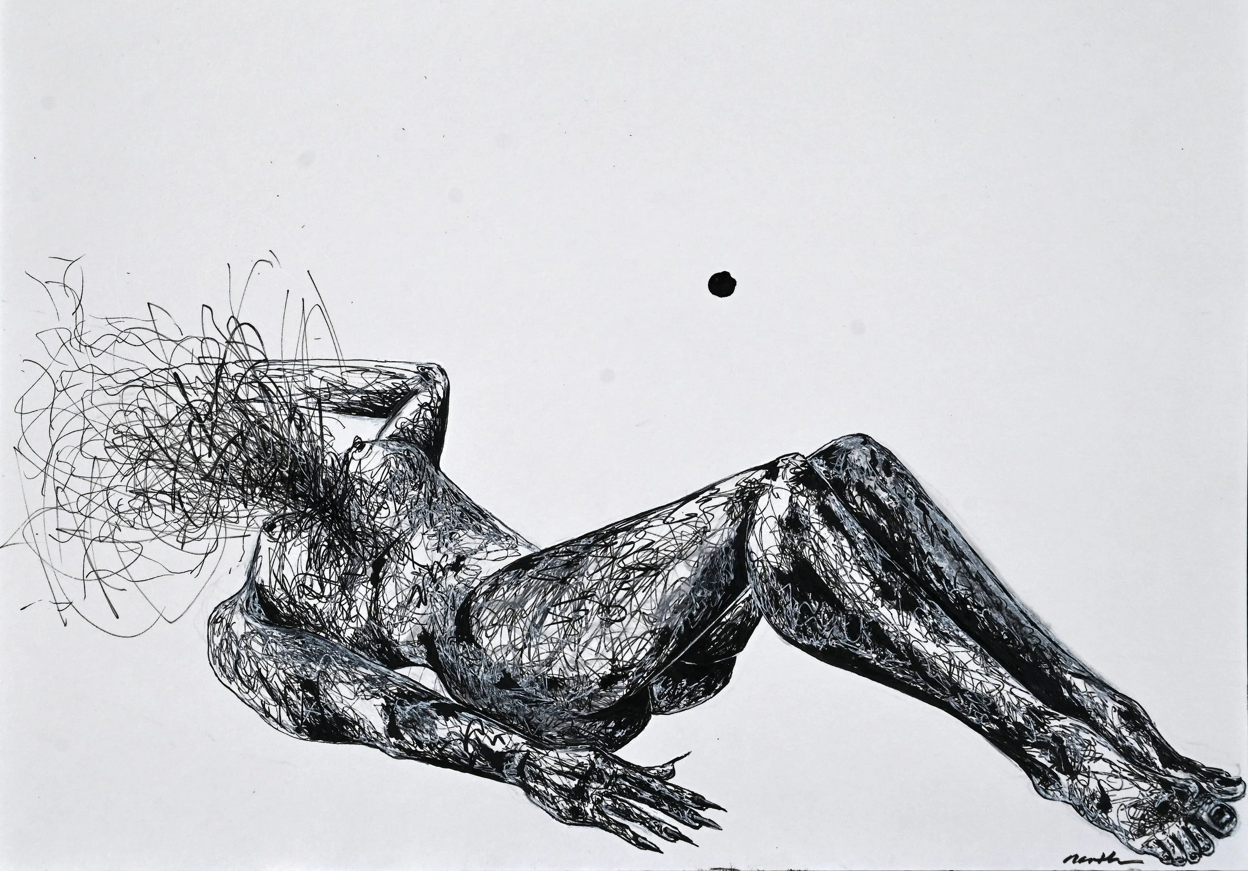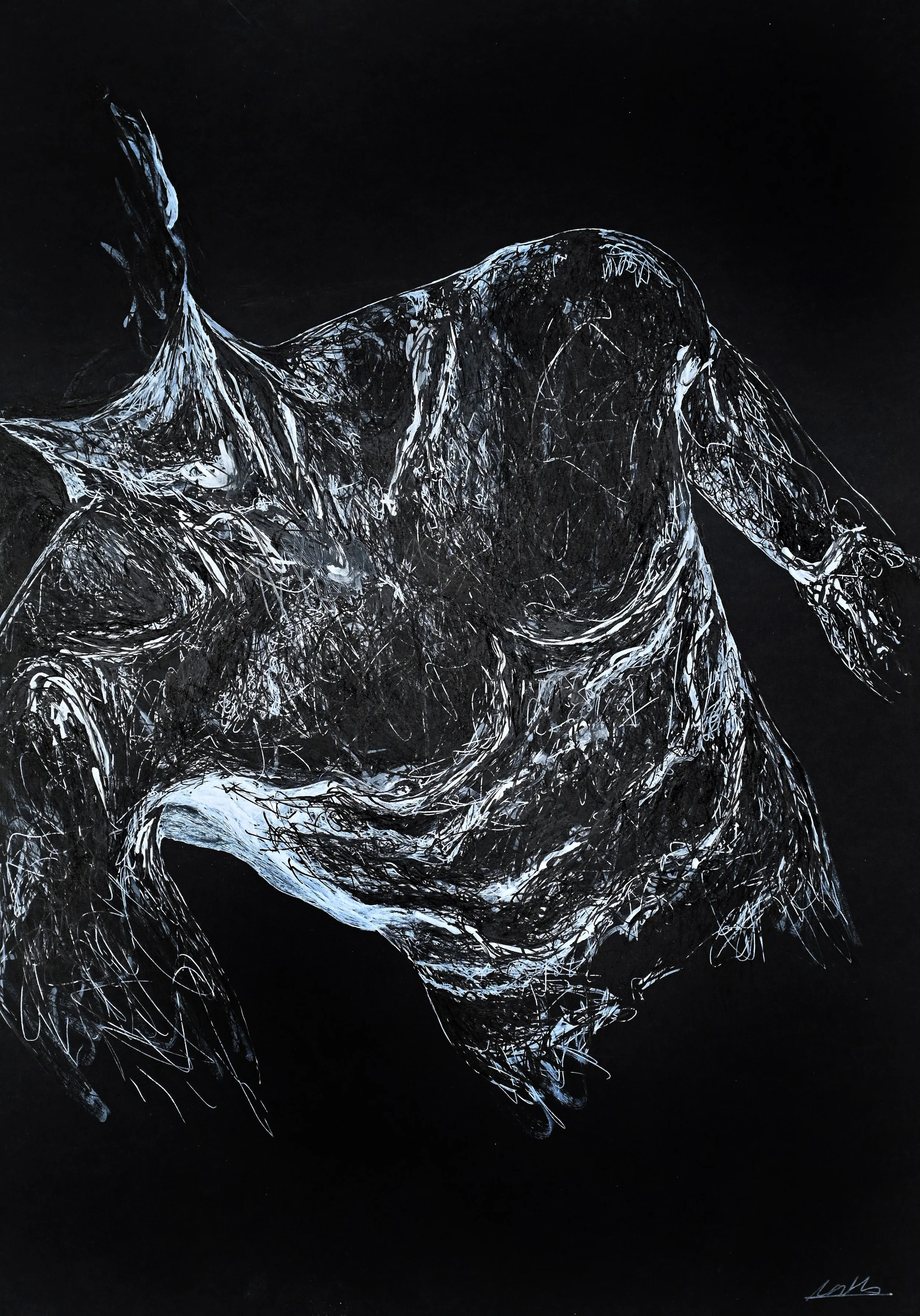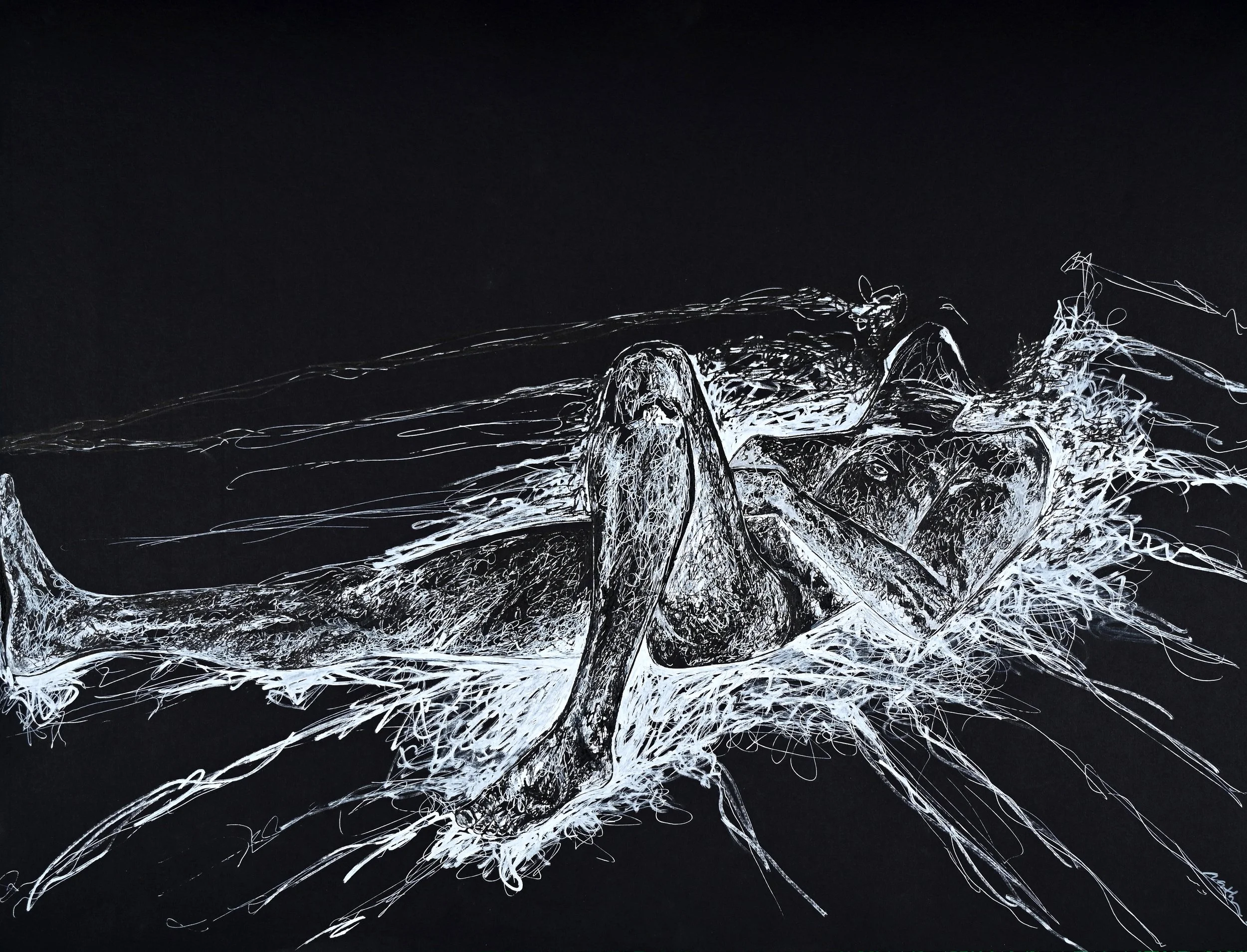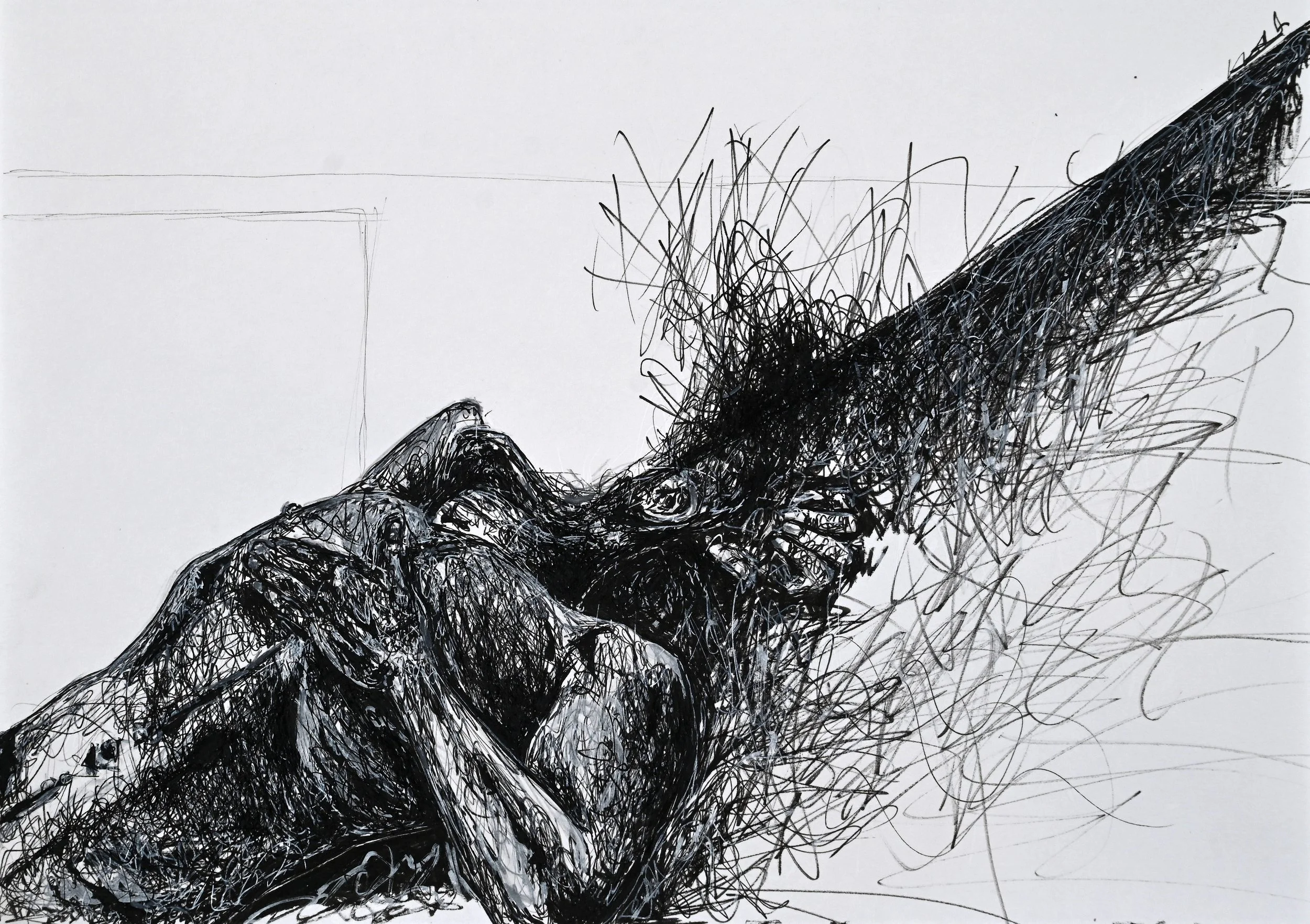 Nous avons tous et toutes nos parts d’ombres. J’ai donc décidé de dessiner des nus en noir et blanc et d’accentuer les jeux de lumière et d’ombres. Les visages ne m’intéressent pas beaucoup, certains dessins ressemblent à des Nudes, des selfies sans tête. Alors on s’attache à observer la singularité du corps, les émotions qu’il exprime lorsque le visage est absent. Je travaille aussi avec différentes épaisseurs de traits, j’enchaine rapidement les couches afin de produire cet amoncellement de vécus intérieurs, à l’image de ce que chacun peut vivre dans son existence. Ça m’évoque aussi les circonvolutions de la pensée, le grand concert qui peut se produire à l’intérieur de chacun. C’est un peu comme une radiographie. Si l’on regarde les mains ainsi représentées, elles sont longues, décharnées, griffues telles des mains de sorcières. Elles sont la pour souligner le caractère magique et puissant des modèles que je choisis.